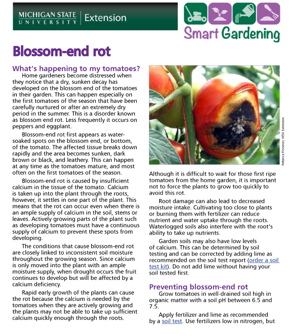 Garden soils may also have low levels of calcium. This can be determined by soil testing and can be corrected by adding lime as recommended on the soil test report (order a soil test kit). Do not add lime without having your soil tested first.