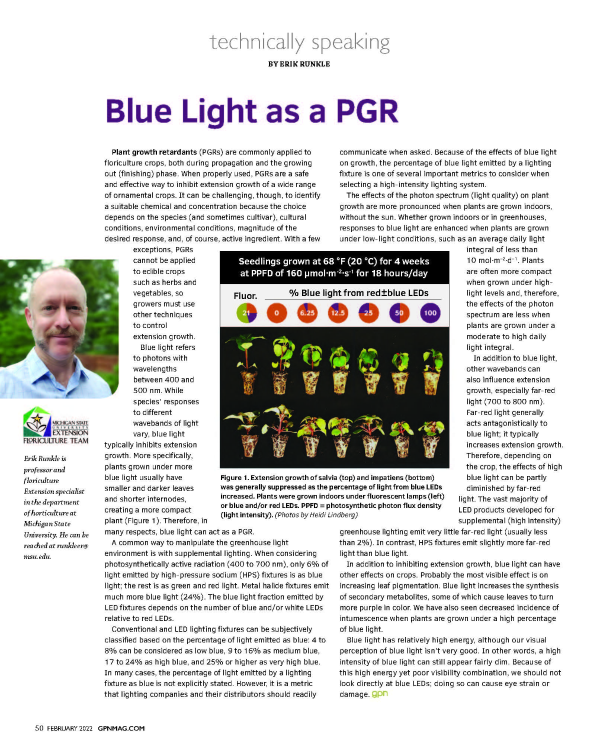 Blue light generally inhibits extension growth and thus can act as a plant growth retardant (PGR), particularly when crops are grown indoors or in greenhouses during low-light periods.