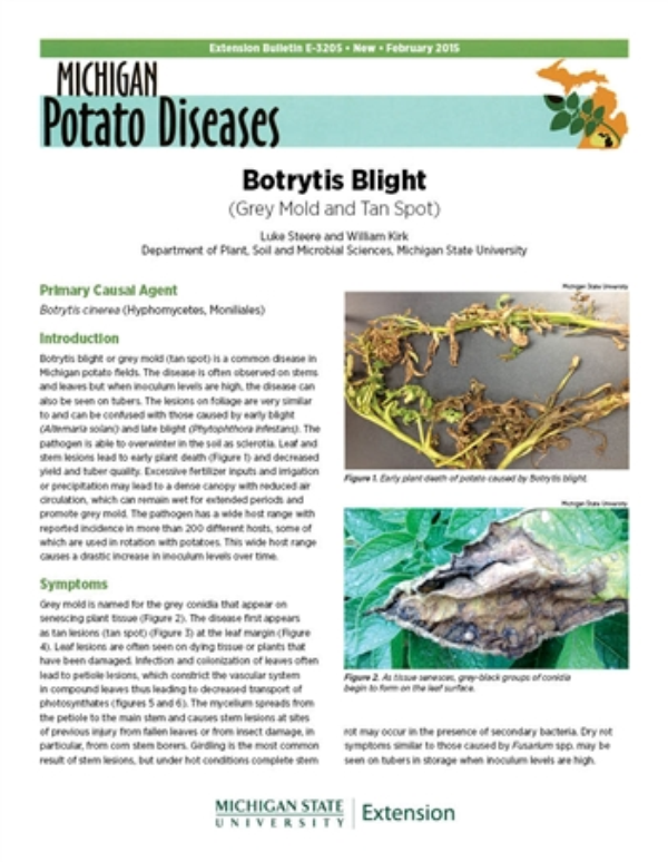 Botrytis blight or grey mold (tan spot) is a common disease in Michigan potato fields. The disease is often observed on stems and leaves but when inoculum levels are high, the disease can also be seen on tubers. The lesions on foliage are very similar to and can be confused with those caused by early blight (Alternaria solani) and late blight (Phytophthora infestans). The pathogen is able to overwinter in the soil as sclerotia. Leaf and stem lesions lead to early plant death (Figure 1) and decreased yield and tuber quality. Excessive fertilizer inputs and irrigation or precipitation may lead to a dense canopy with reduced air circulation, which can remain wet for extended periods and promote grey mold. The pathogen has a wide host range with reported incidence in more than 200 different hosts, some of which are used in rotation with potatoes. This wide host range causes a drastic increase in inoculum levels over time.