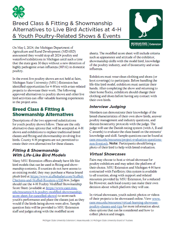 In the event live poultry shows are not held at fairs, Michigan State University (MSU) Extension has identified opportunities for 4-H’ers with avian-related projects to showcase their work. The following approved alternatives to poultry shows and other live bird activities can offer valuable learning experiences in the project area.