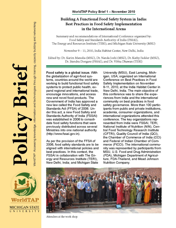 WorldTAP Policy Brief 1 – November 2010 Building A Functional Food Safety System in India: Best Practices in Food Safety Implementation in the International Arena