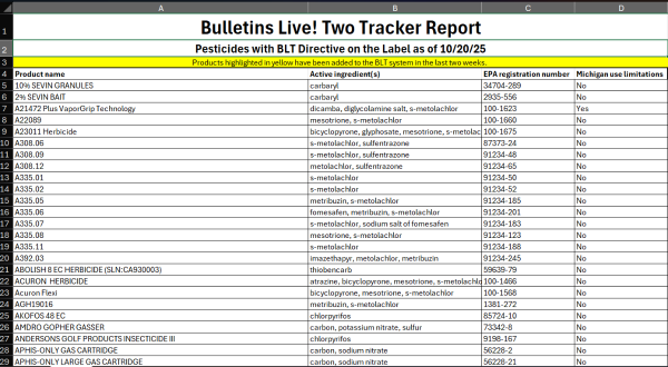 It can be difficult for applicators to stay up to date on changes to Bulletins Live! Two (BLT) that impact pesticide label directives and in some cases, involve additional pesticide use limitations. To help raise awareness of ongoing changes, Michigan State University Extension is generating a biweekly BLT Tracker Report that lists pesticide products that currently require applicators to use the BLT system and highlights products with pesticide use limitations in Michigan.