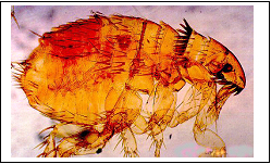 The cat flea is the most commonly encountered flea species in Michigan. The dog flea, Ctenocephalides canis, is usually found on wild animals, rather than on domestic pets. Both species prefer dogs and cats as hosts but they are found on a wide variety of other animal including rodents and livestock, which helps explain why some people who do not keep pets in their homes experience flea problems. Both species are intermediate hosts of the dog tapeworm that is common in both dogs and cats. The tapeworm is transmitted when the animal ingests infested fleas. This tapeworm may infect children if they accidentally ingest infested fleas. While cat and dog fleas prefer non-human hosts, they will feed readily on humans when infestations are heavy or when non-human host is not available. Like female mosquitoes, fleas have pierce-sucking mouthparts that enable the flea to suck blood from its host. Adult fleas are wingless but their powerful legs enable them to jump considerable distances.