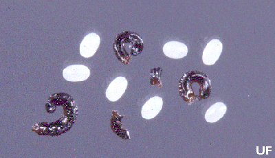 Under ideal conditions (hot and humid weather) cat fleas can complete a life cycle in as little time as three weeks, however this development time is extended to several months under less than ideal conditions. Eggs are usually laid on the host and fall off as the animal moves about. Most eggs hatch in 7-14 days but under ideal conditions they may hatch in little as 2 days. Flea larvae are small, active, maggot-like creatures. They can feed on all sorts of organic debris, but they require at least some adult feces, which is essentially dried blood, to complete their development. The larval stages are passed in about a week, or up to several months, depending on environmental conditions and food availability. A mature flea larva measures about 1/16-1/8 of inch long and about 1/64 of an inch wide so it is no wonder that they are rarely seen. When mature, the larva spins a cocoon that becomes camouflaged with lint and other debris that sticks to it. Most fleas emerge from the pupa in 7-14 days, but some may not emerge for several months to a year later. These dormant or fleas “in waiting” represent an important survival strategy of fleas because they do not emerge until triggered by some event that signals the presence of a potential host. Warm and humid weather, the presence of carbon dioxide exhaled from a warm blooded animal, or mechanical signals such as vibrations from nearby footsteps or the weight of an animal actually stepping the cocoon will trigger emergence. This behavior can result in unwelcomed swarms of hungry fleas greeting returning vacationers or people who have just moved into a home or apartment. NO INSECTICIDE TREATMENT WILL KILL FLEA PUPAE.