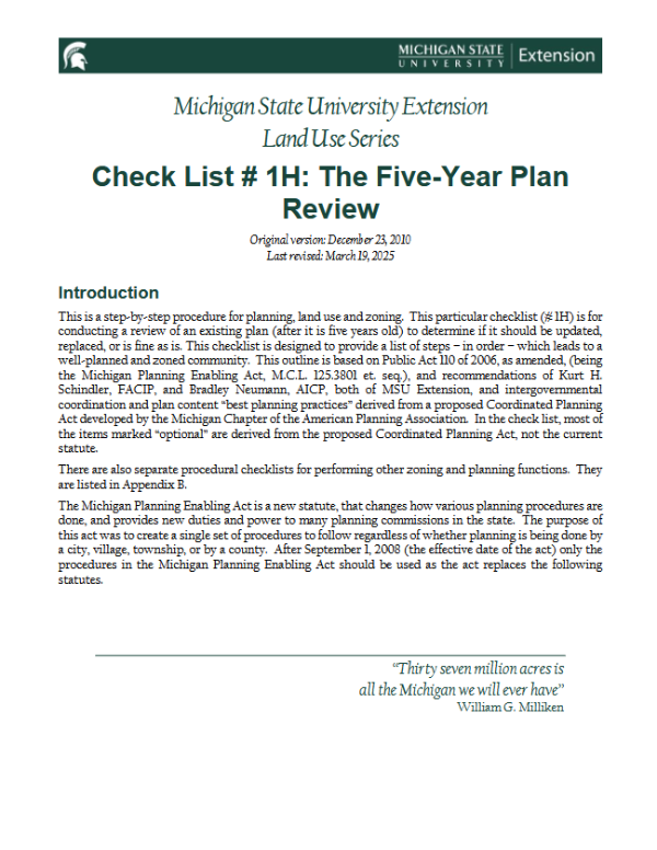 Once a plan is over five years old, it needs to be reviewed to determine if it should be replaced or not. This document presents a chronological step-by-step checklist to walk a county, village and city, or township through the process of assessing its existing plan.