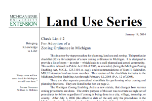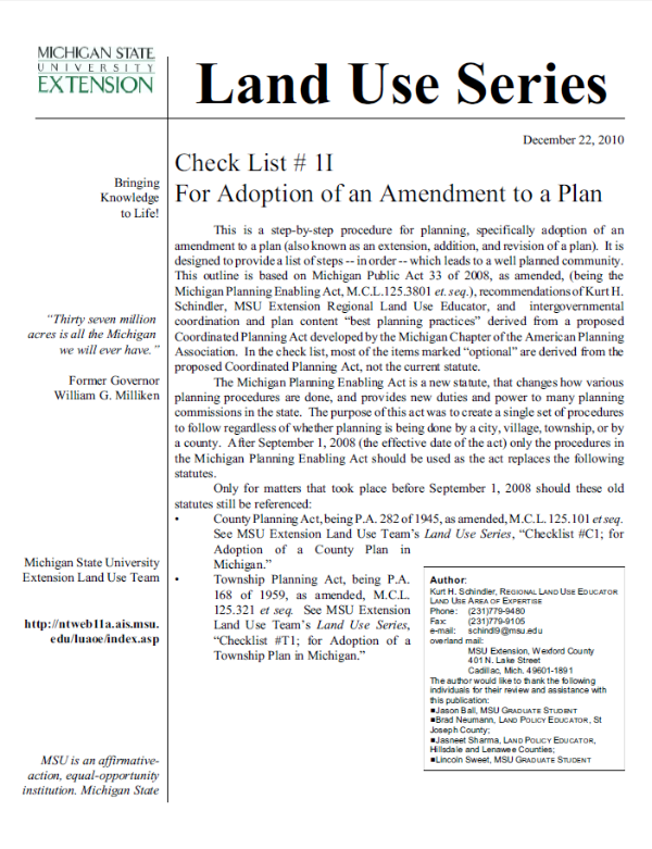 Presents a chronological step-by-step checklist to walk a county, village and city, or township through the process of adopting a plan amendment in Michigan. The checklist follows Michigan Planning Enabling Act of 2008 (and Michigan Zoning Enabling Act of 2006, as amended,) statutory requirements, superceding the old acts as of September 1, 2008