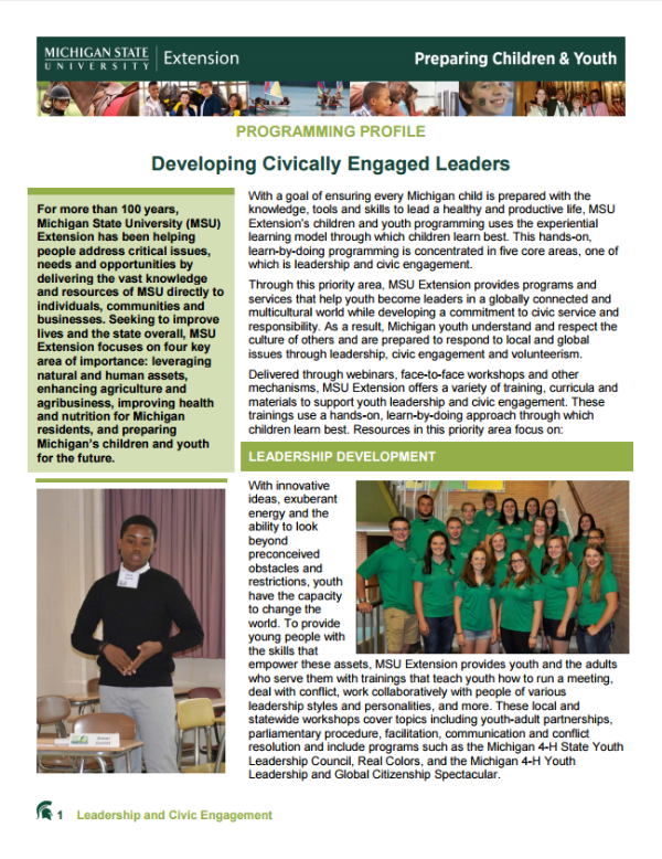 Through this priority area, MSU Extension provides programs and services that help youth become leaders in a globally connected and multicultural world while developing a commitment to civic service and responsibility. As a result, Michigan youth understand and respect the culture of others and are prepared to respond to local and global issues through leadership, civic engagement and volunteerism.