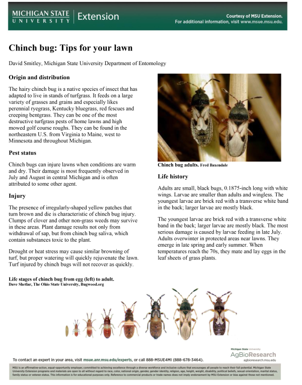 Recent research in Michigan revealed chinch bugs are widespread, but rarely abundant enough to cause damage. In a survey of the Lansing area, less than 5 percent of the lawns visited had enough chinch bugs to cause damage.