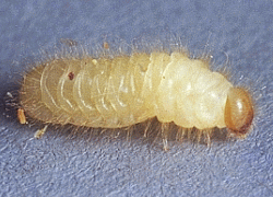As the common name suggests, the cigarette beetle is an important pest of stored tobacco. It is a common kitchen pest as well and is known to feed on almost anything including cottonseed meal, rice, pepper, paprika, crude drugs, seeds, dried plants and even books, and other processed cereal products. It is also known to breed in animal matter such as dead insects, dried fish and fishmeal, animal meal, and probably the remains of dead animals. Adult beetles live 2 to 4 weeks, and during this time, each female may lay as many as 100 eggs. Under favorable conditions, 6 to 8 weeks is required to develop from an egg to adult.