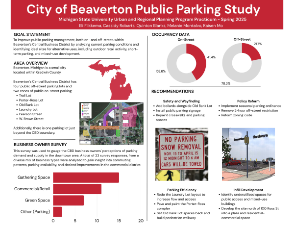 To support Beaverton’s future development, the practicum team’s long-term recommendations focus on smart infill development, infrastructural upgrades, and increased pedestrian connectivity. These recommendations include directives for infill growth in underutilized areas, upgrades to off-street parking lots, and the construction of a pedestrian bridge to increase accessibility. By repurposing select parking areas for mixed-use commercial activity and public gathering spaces, the city can conceive a more walkable and pedestrian-friendly downtown. Additionally, paving the Porter-Ross parking lot will guarantee greater parking opportunities while aiding future development. Finally, construction of the Trail of Two Cities pedestrian bridge will supply a crucial non-motorized network between Beaverton and Gladwin, further encouraging access.
