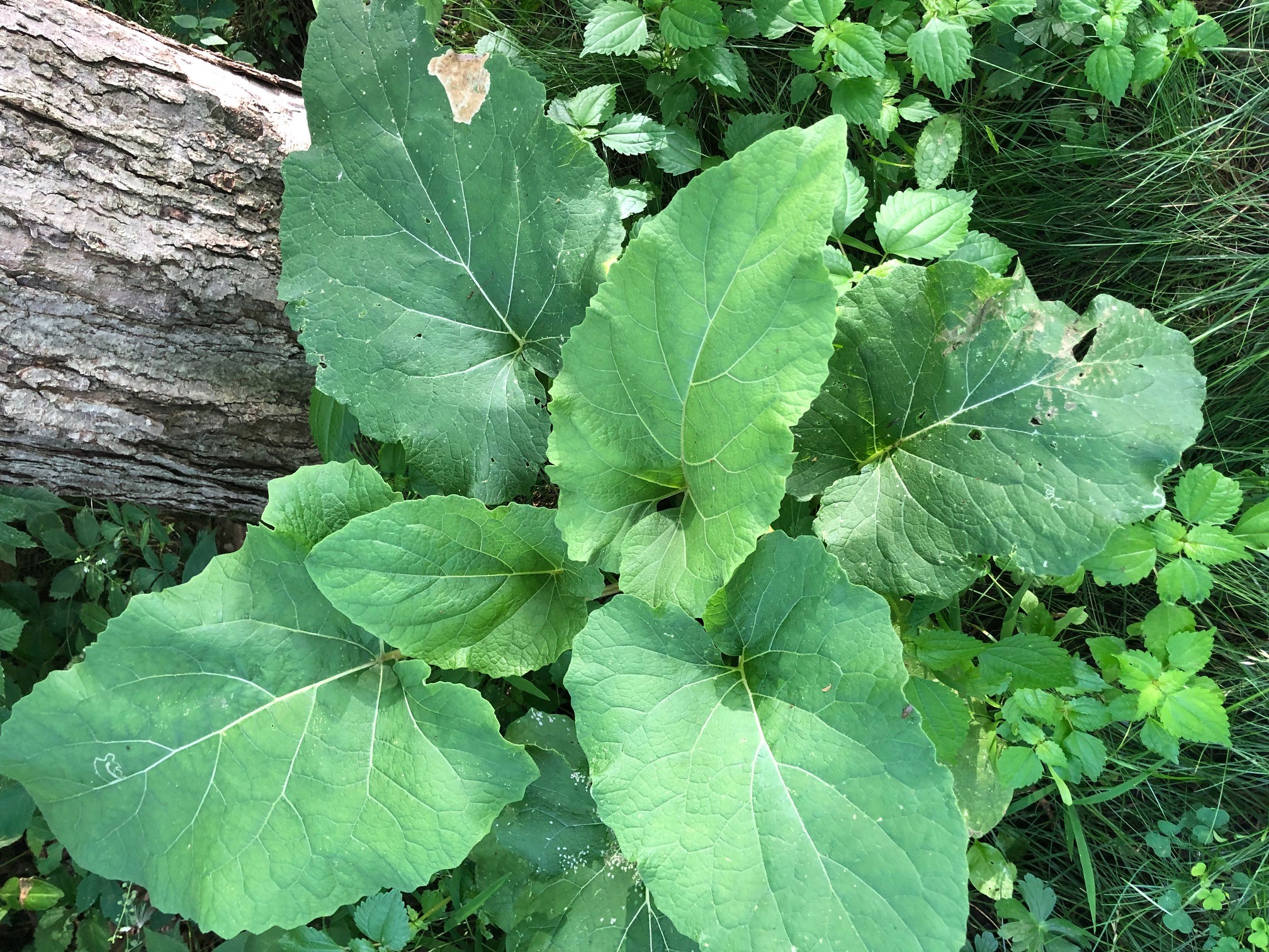 Produces a large basal rosette the first year. Young leaves are egg shaped and have coarse veins. Basal leaves are heart-shaped with toothed or wavy margins. Second year plants produce large alternate leaves on a branched erect stem. These leaves are smaller than the basal leaves and narrowly to broadly egg shaped. All leaf undersides are whitish green below and dull green above. They are nearly glabrous on the surface and finely pubescent below. The long petioles have a furrow above and are hollow inside.