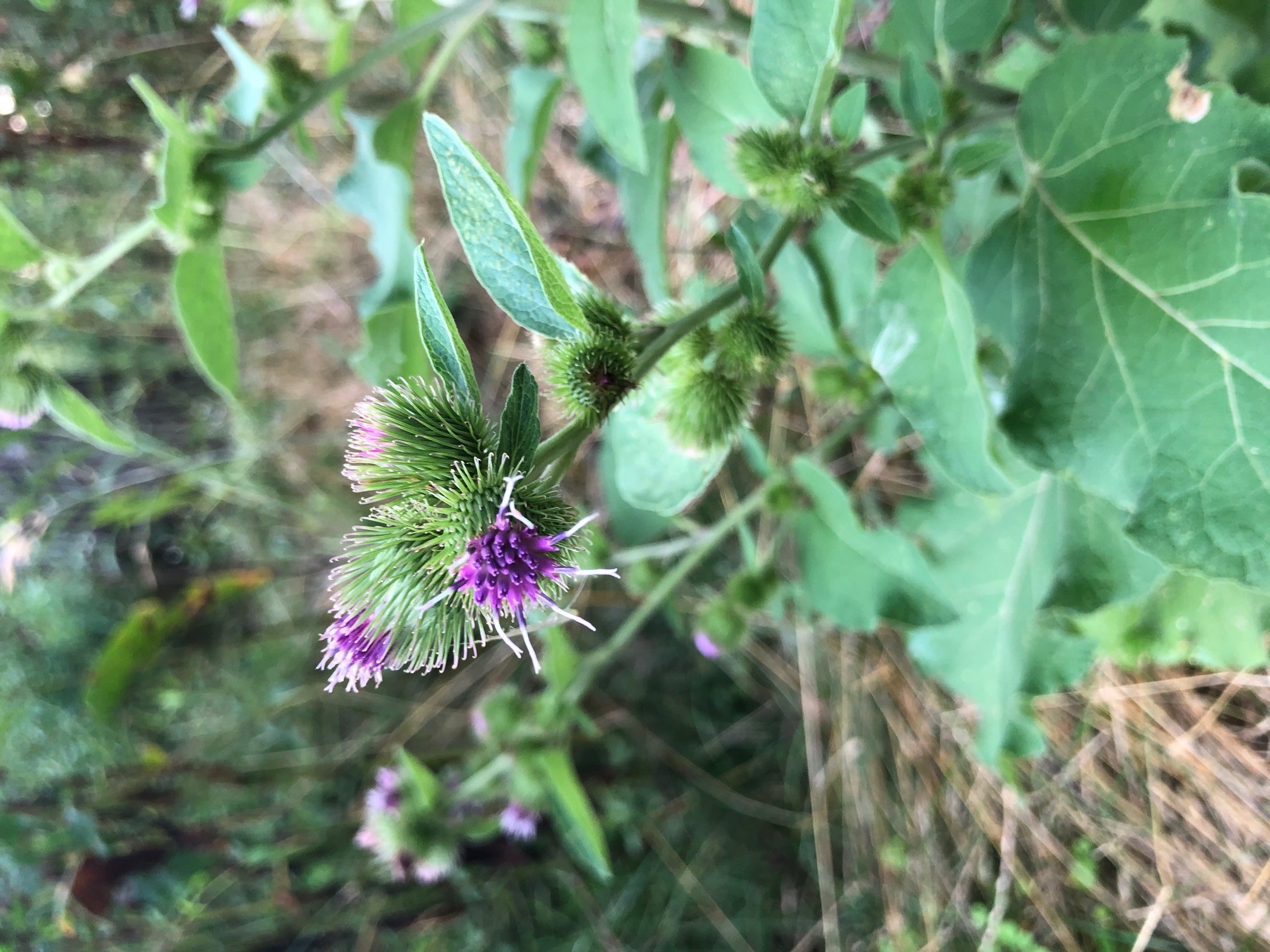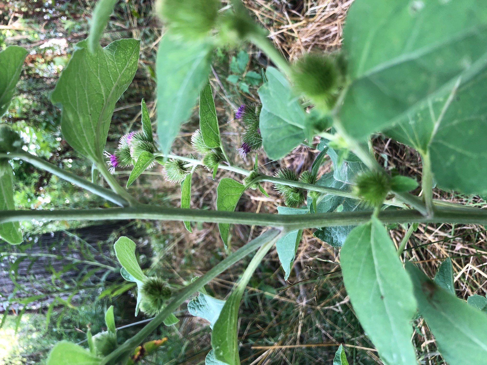 Flowers will develop from the leaf axils or small clusters at the end of branches. They are usually some shades of pink or purple. The flower heads will dry and form a bur. The burs will persist and remain on the stalks during the fall. The hooked bracts will attach to animal fur or clothing to disperse the entire head. Seeds are enclosed in the bur.