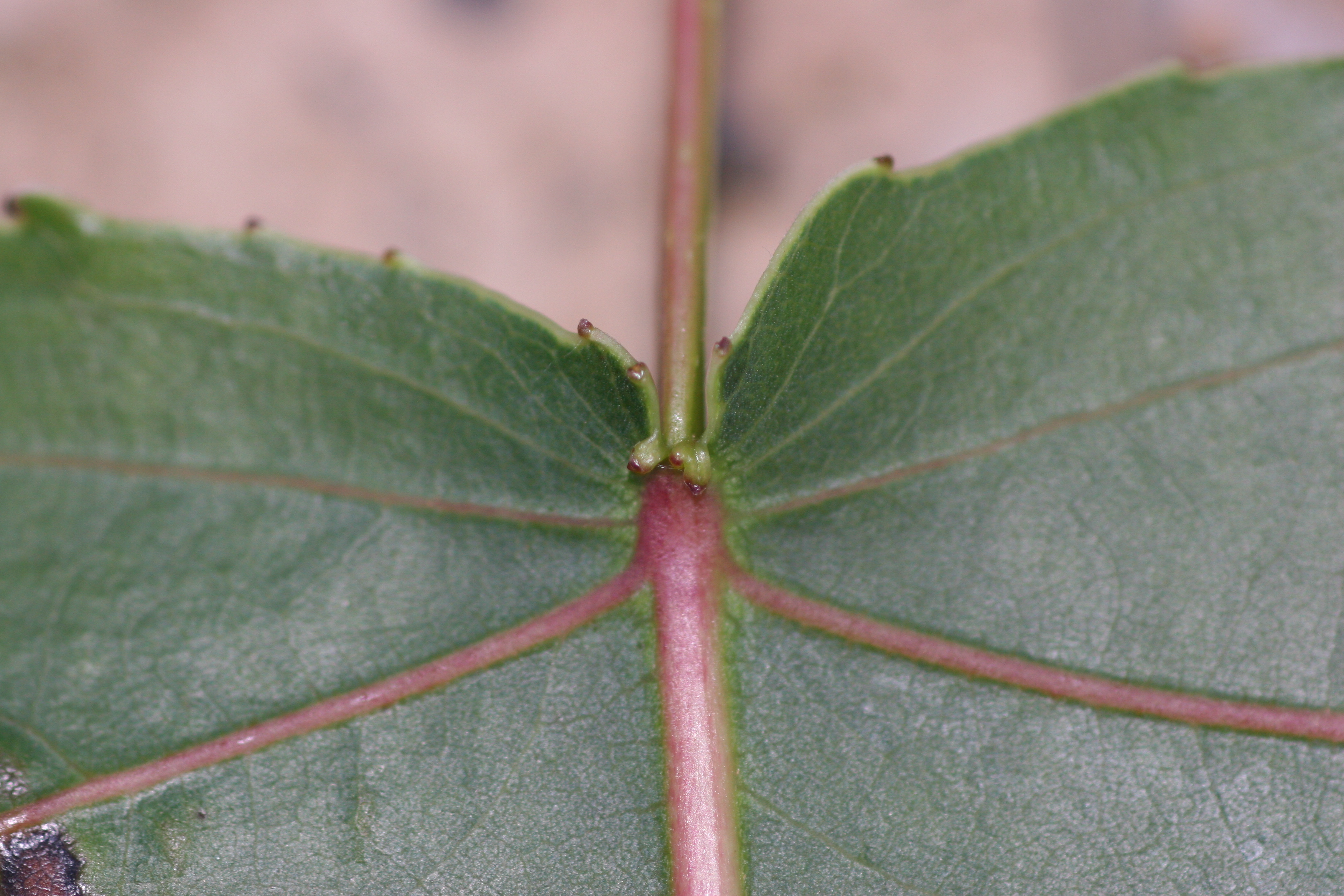 Alternate, simple, broadly triangular, 3 to 5 inches long with coarse, incurved-toothed margins and a smooth base. Leaves are shiny green above and have two to five prominent, fingerlike glands where the long, flattened petiole attaches to the leaf. Margins are outlined by a colorless border.