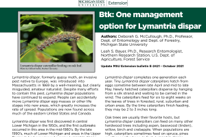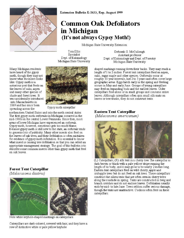 Many Michigan residents have heard of the gypsy moth, though they may not know what the insect looks like. Gypsy moth is a notorious pest that feeds on the leaves of oaks, aspen and many other species of shade and forest trees. It was accidentally introduced into Massachusetts in 1869 and has since been spreading across the northeastern United States and into the north central states. The first gypsy moth outbreaks in Michigan occurred in the mid-1980s in the central Lower Peninsula. Since then, most areas of lower Michigan have experienced an outbreak. Gypsy moth, however, sometimes gets too much blame. Because gypsy moth is still new to the state, an outbreak tends to generate lots of publicity. Many other insects also feed on the leaves of oak trees, and their defoliation is often mistaken for evidence of gypsy moth infestation. It is essential to know what insect is causing tree defoliation so that you can select an appropriate management strategy. The goal of this bulletin is to describe some common insects other than gypsy moth that feed on oak leaves.