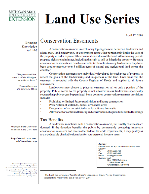 This pamphlet reviews conservation easements as a means to protect natural areas, conservation values of land, open space, and so on. It covers the tax credits involved, development impacts, pros and cons to doing so, and lists Michigan Land Conservancies and Land Trusts.