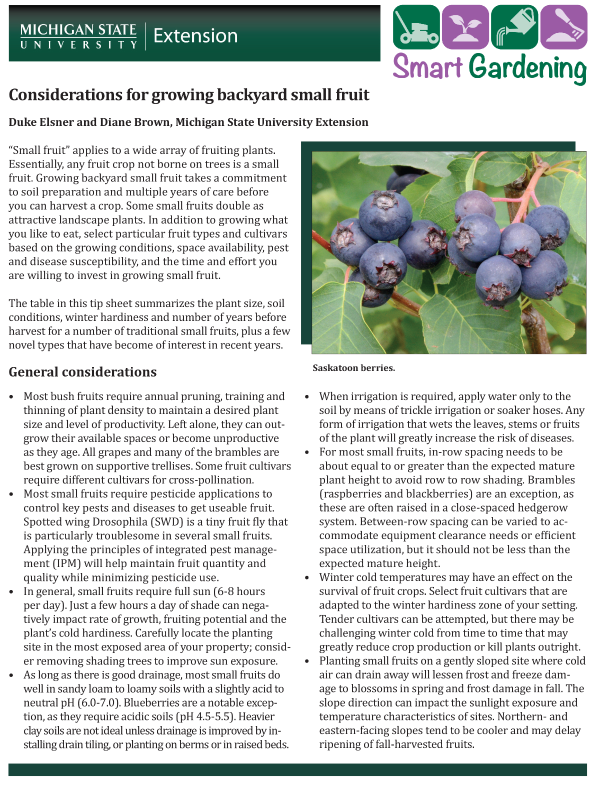 The term “small fruit” applies to a wide array of fruiting plants. Essentially, any fruit crop that is not borne on trees is a small fruit. Growing backyard small fruit takes a commitment to soil preparation and multiple years of care before you can harvest a crop. Some small fruits double as attractive landscape plants. In addition to growing what you like to eat, select particular fruit types and cultivars based on the growing conditions, space availability, pest and disease susceptibility, and the time and effort you are willing to invest in growing small fruit.