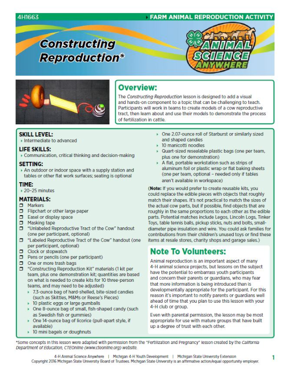 The Constructing Reproduction lesson is designed to add a visual and hands-on component to a topic that can be challenging to teach. Participants will work in teams to create models of a cow reproductive tract, then learn about and use their models to demonstrate the process of fertilization in cattle.