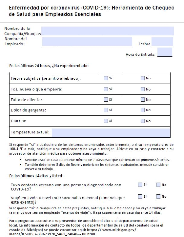 Coronavirus Disease (COVID-19):Health Screening Tool for Essential Employees - Spanish