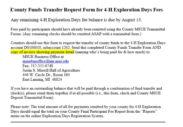 County Funds Transfer Request Form for 4-H Exploration Days Fees