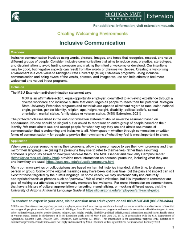 Inclusive communication involves using words, phrases, images, and tones that recognize, respect, and value different groups of people. Consider inclusive communication that aims to reduce bias, prejudice, stereotypes, and discrimination to avoid hurting someone and making them feel unwelcome or devalued. Our intentions may be good, but negative impacts can result from the words or phrases we choose. Creating a welcoming environment is a core value to Michigan State University (MSU) Extension programs. Using inclusive communication and being aware of the words, phrases, and images we use can help others to feel more welcomed and valued in our programs.