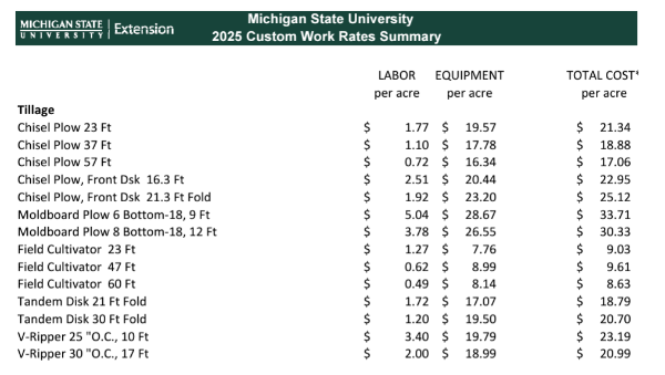 The 2025 MSU Custom Work Rates Summary provides a list of totals, also dividing them between labor and equipment costs.