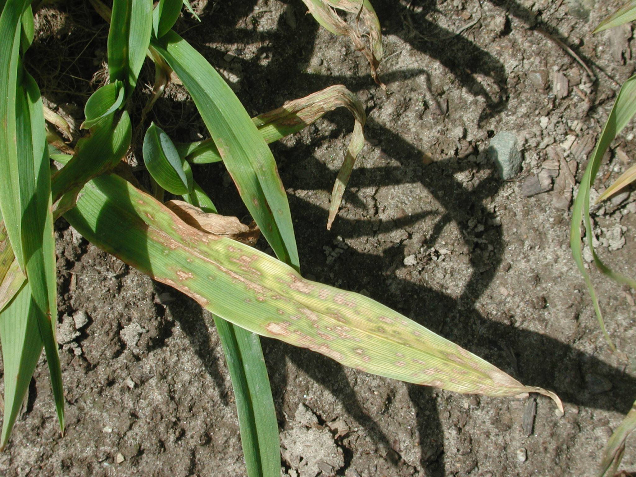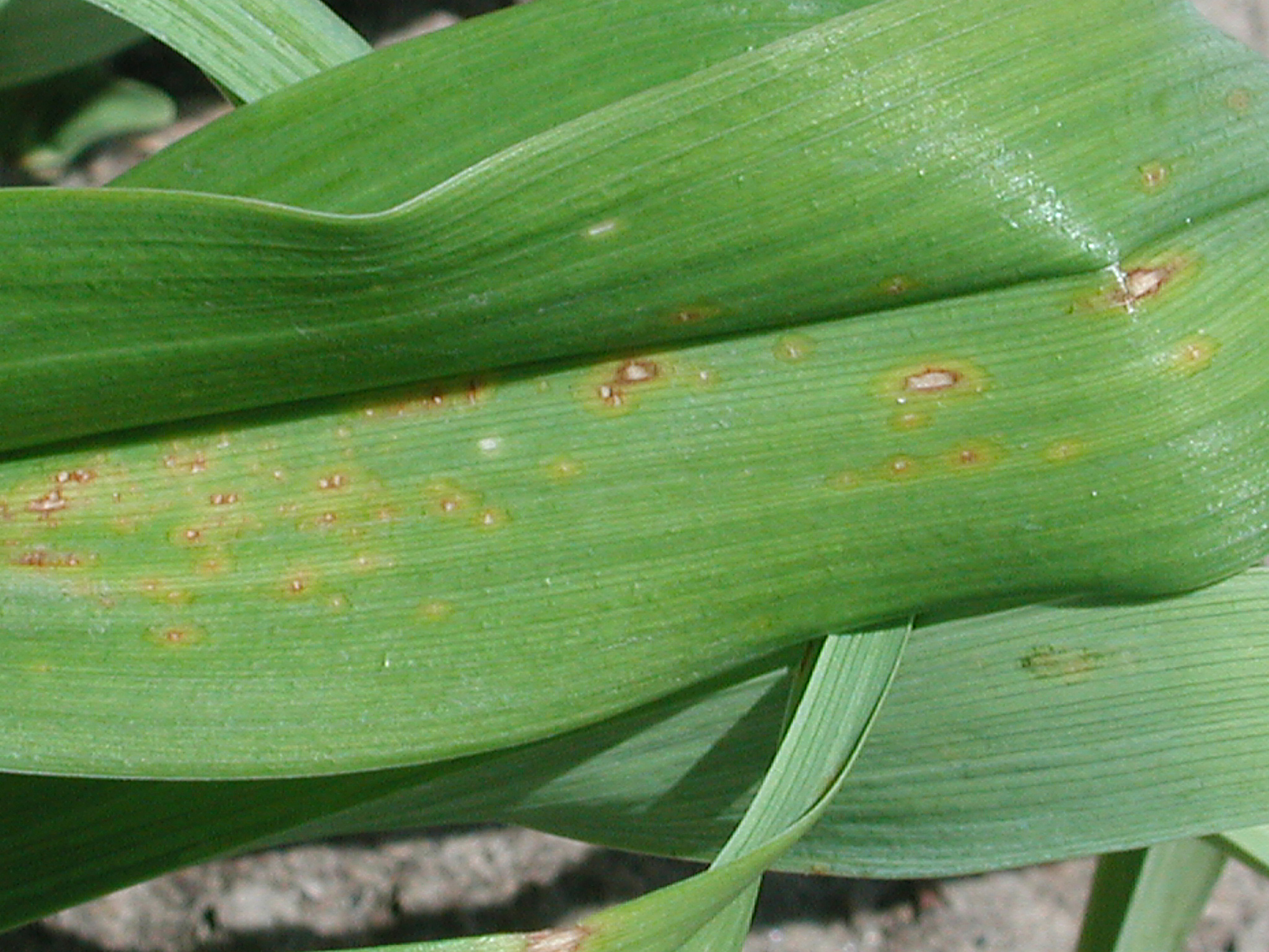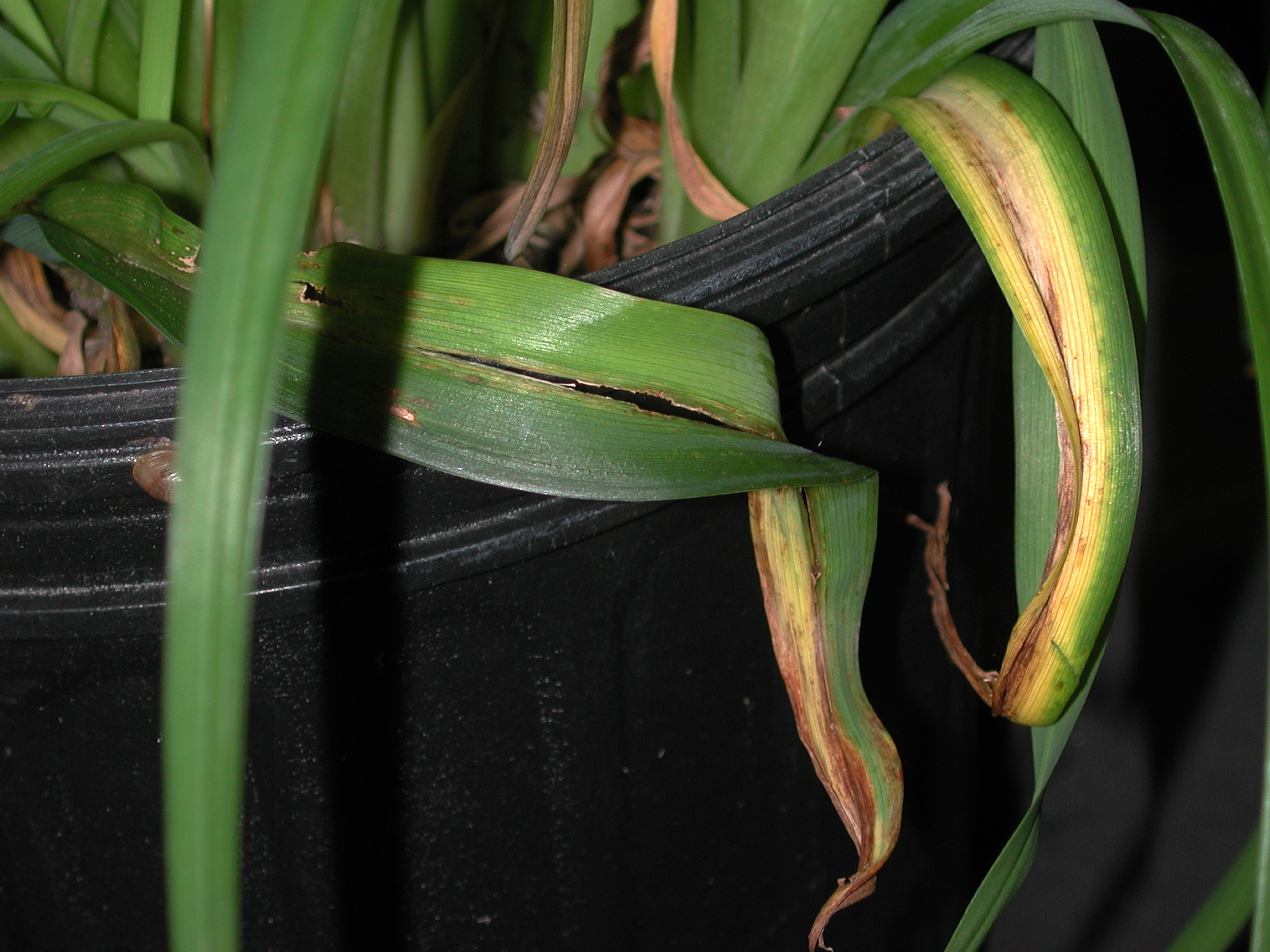 Symptoms: Elongated brown lesions, which are lengthwise on the foliage, surrounded by a chlorotic halo. Lesions that affect the midrib of a leaf cause the leaf to senesce from the lesion to the leaf tip. Tissue in the center of the leaf becomes necrotic, creating a dead “streak” down the middle of the infected leaf. Flower production may be decreased.