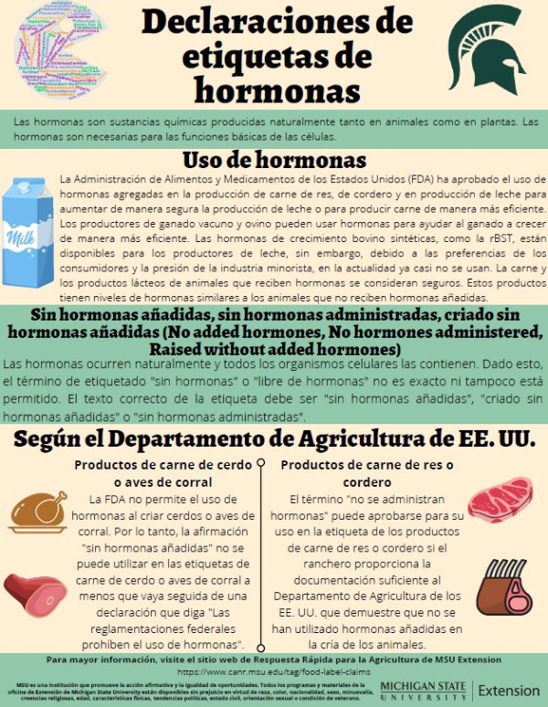 El término "no se administran hormonas" puede aprobarse para su uso en la etiqueta de los productos de carne de res o cordero si el ranchero proporciona la documentación suficiente al Departamento de Agricultura de los EE. UU. que demuestre que no se han utilizado hormonas añadidas en la cría de los animales.