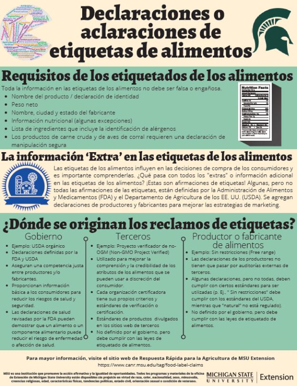 Las etiquetas de los alimentos influyen en las decisiones de compra de los consumidores y es importante comprenderlas. ¿Qué pasa con todos los "extras" o información adicional en las etiquetas de los alimentos? ¡Estas son afirmaciones de etiquetas! Algunas, pero no todas las afirmaciones de las etiquetas, están definidas por la Administración de Alimentos y Medicamentos (FDA) y el Departamento de Agricultura de los EE. UU. (USDA). Se agregan declaraciones de productores y fabricantes para mejorar las estrategias de marketing.