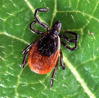 The black-legged tick or deer tick, is the main vector of Lyme disease. Lyme disease symptoms, caused by coiled spirochete bacteria (Borrelia burgdorferi), develop within 3 to 32 days and include an initial reddish skin rash at the tick bite site, commonly expanding to many inches in diameter and appearing like a ring or bull’s-eye. The rash fades, with or without treatment, after a few weeks (not all infected people develop this rash). Early symptoms include flu-like chills, fever, headache, dizziness, fatigue, joint ache, and a stiff neck. Subsequent symptom progression involves swelling and pain in the joints, especially the knees that can lead to chronic arthritis, sometimes a year after the bite. Less common symptoms include heart arrhythmia, weakness in legs, facial paralysis, and numbness. Antibiotic therapy is most successful when treatments begin during early stages of the disease development.