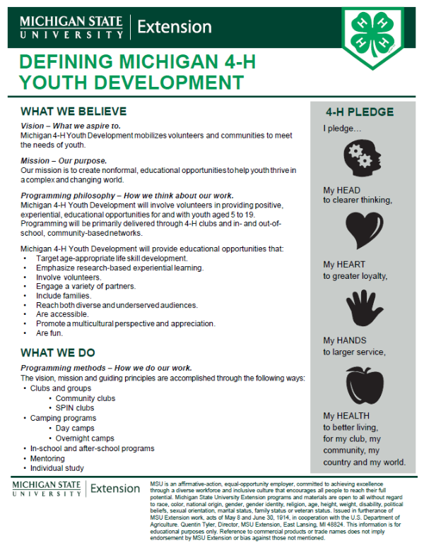 4-H Youth Development is the youth program of Michigan State University Extension. 4-H staff work at Michigan State University and in every Michigan county with local volunteers to bring the knowledge of the state’s land-grant university to the citizens of Michigan. This work is done in partnership with and uses funding provided by local county boards of commissioners, the state of Michigan and the federal government through the U.S. Department of Agriculture. Additional intellectual and programming support and funding is provided by a variety of public and private partners – both at local and state levels – to increase our impact on youth in Michigan communities.