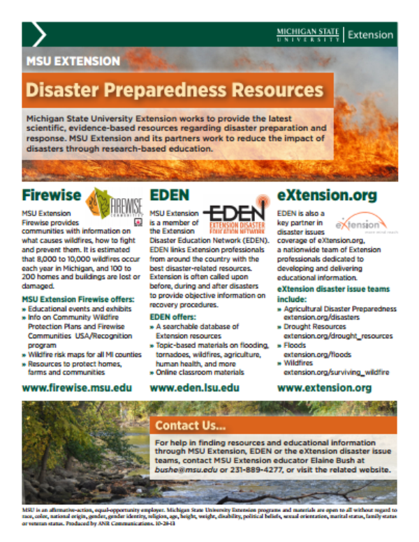 One page flyer providing basic information and website addresses for three disaster-related resources available through MSU Extension….Firewise, EDEN (Extension Disatser Education Network) and extension.org.