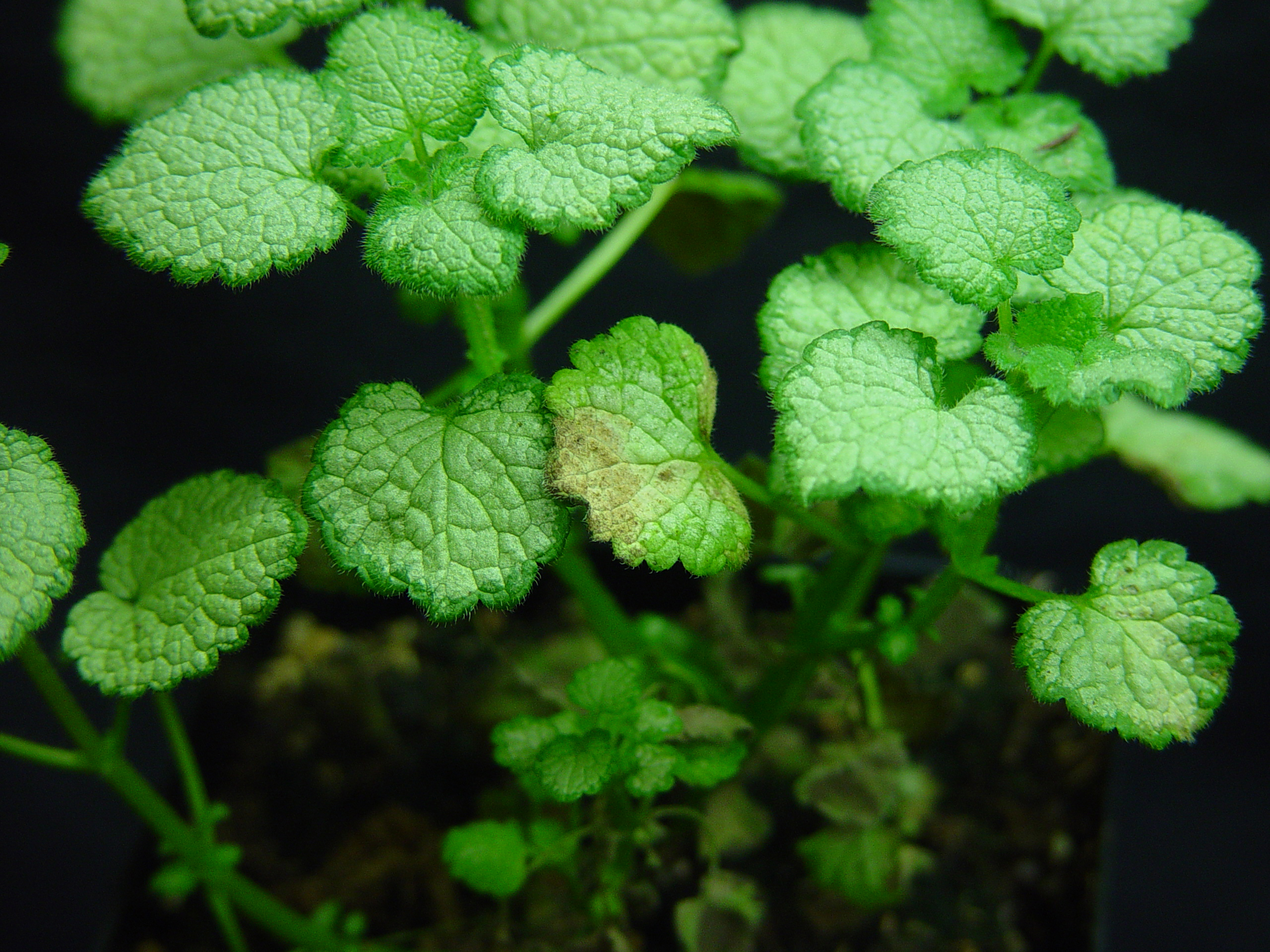 Symptoms: Fuzzy gray to black mold on the underside of infected leaves. Chlorotic or necrotic lesions on the upper surface of infected leaves. Lesions may have angular edges, some lesions are bordered by veins. Infected foliage may be cupped and new growth may become distorted. Severely affected plants are stunted. Some seedlings can be infected systemically, causing stunting and severe distortion of new growth.