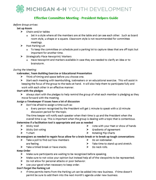 If time permits items from the Parking Lot can be added into new business. If time doesn’t permit be sure to add them into the next month’s agenda under new business.