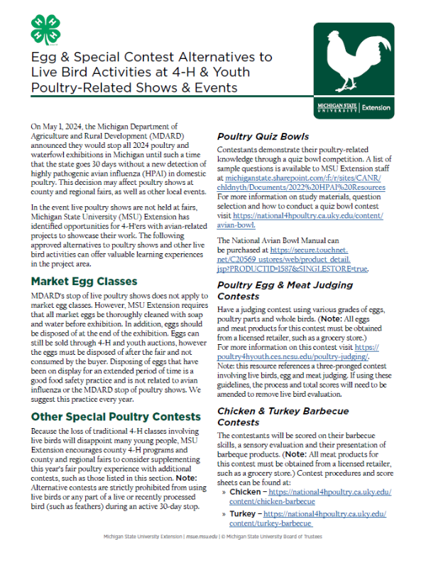 Because the loss of traditional 4-H classes involving live birds will disappoint many young people, MSU Extension encourages county 4-H programs and county and regional fairs to consider supplementing this year’s fair poultry experience with additional contests, such as those listed in this section. Note: Alternative contests are strictly prohibited from using live birds or any part of a live or recently processed bird (such as feathers) during an active 30-day stop.