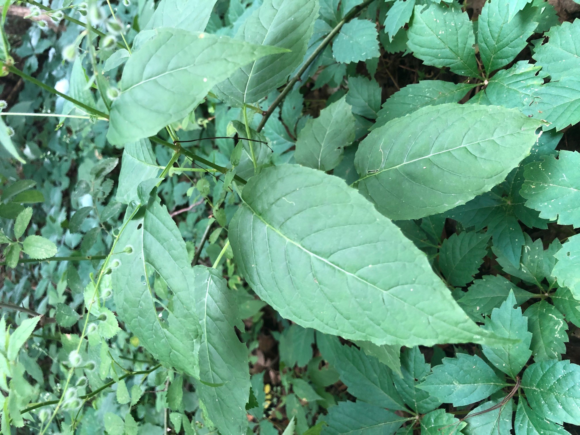 The leaves are opposite and are up to 5” long and 3” wide. They have toothed edges, egg-shaped to oblong, and taper to a point. The petioles are 1-2” long. Leaves tend to become smaller toward the top of the plant.