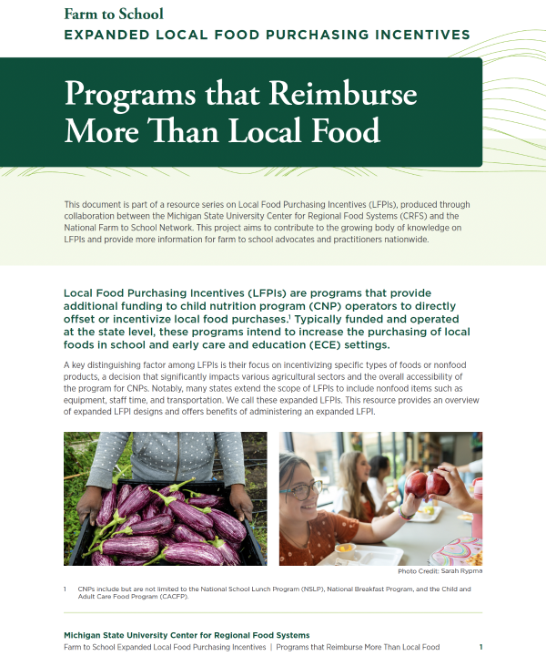 This document is part of a resource series on Local Food Purchasing Incentives (LFPIs), produced through collaboration between the Michigan State University Center for Regional Food Systems (CRFS) and the National Farm to School Network. This project aims to contribute to the growing body of knowledge on LFPIs and provide more information for farm to school advocates and practitioners nationwide.