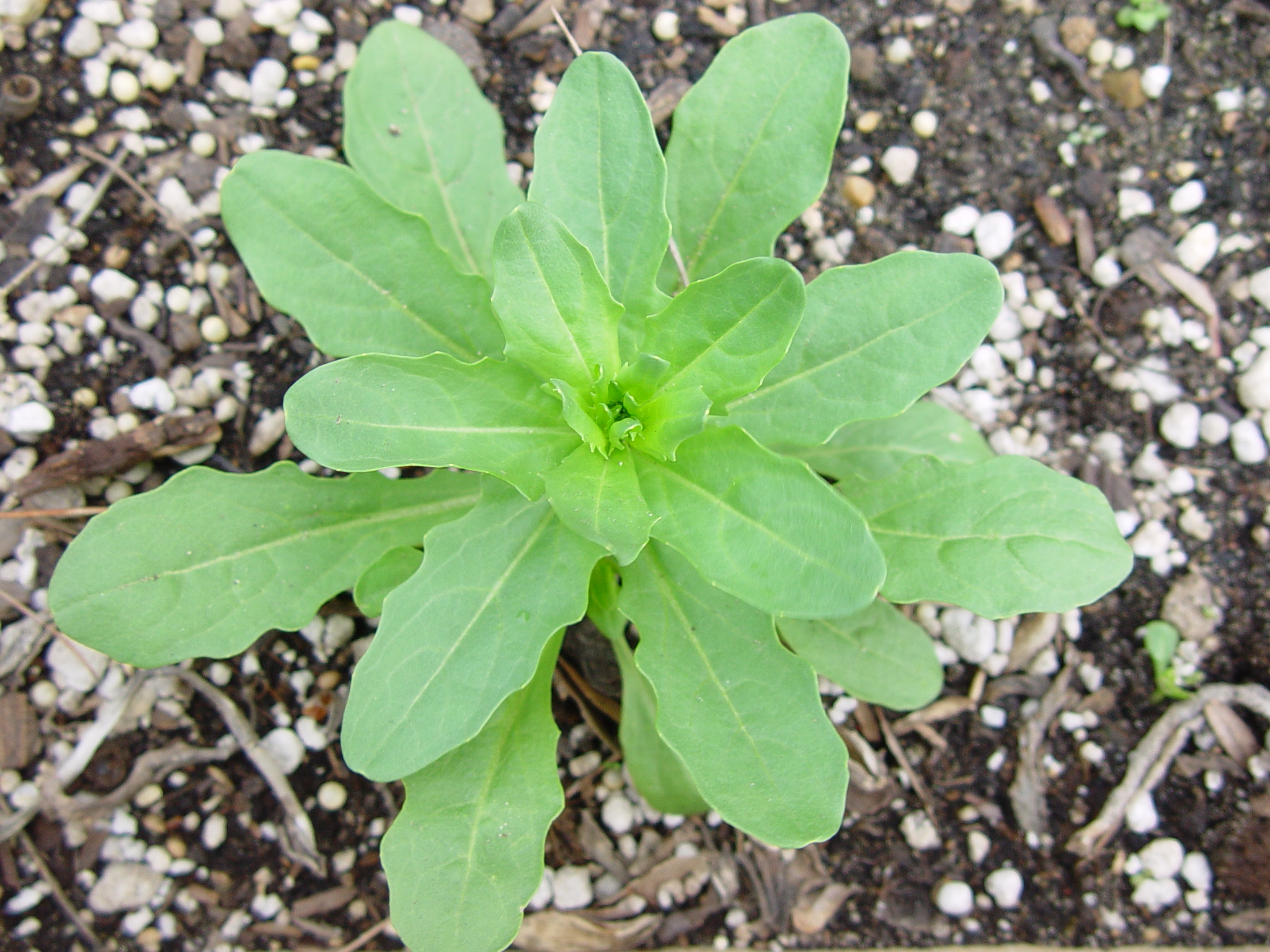 Leaves initially develop from a basal rosette. Lower leaves are oval to spatula-shaped with wavy to slightly toothed margins, rounded tips and distinct petioles. Upper leaves are alternate with toothed to smooth margins and clasping bases. Basal leaves fall off before maturity.