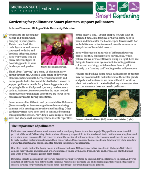 One often thinks first of the honey bee as a pollinator, but over 400 species of native bees live in Michigan. Native bees come in many shapes and sizes, and are often uniquely linked with native trees, shrubs and herbaceous plants, but will also work a widely diverse garden plant palette.