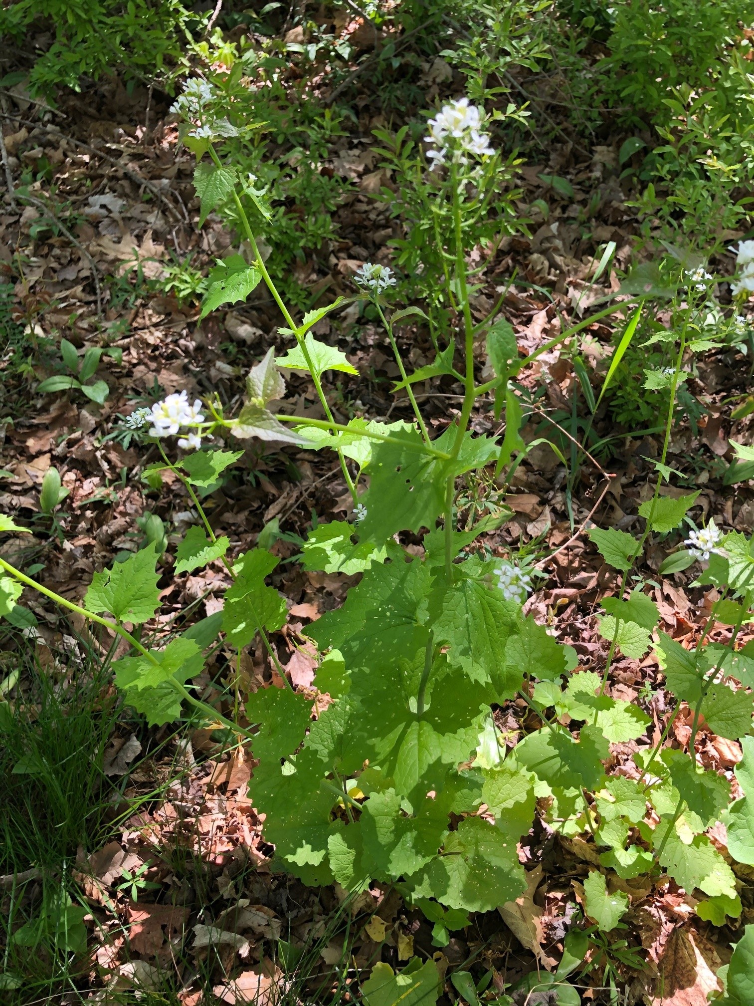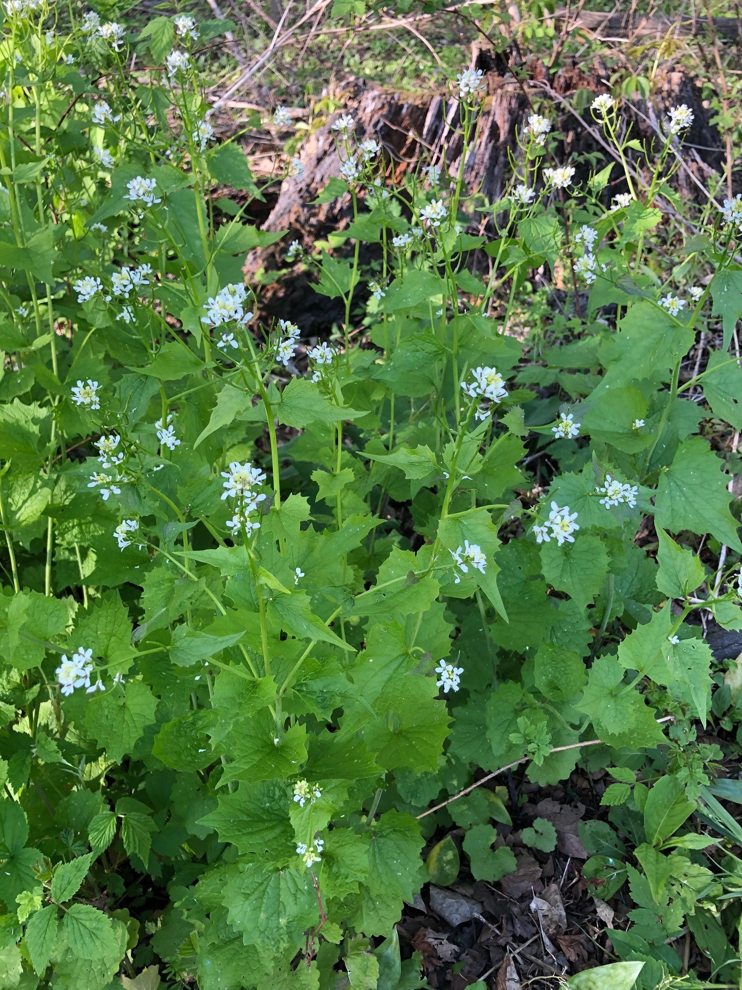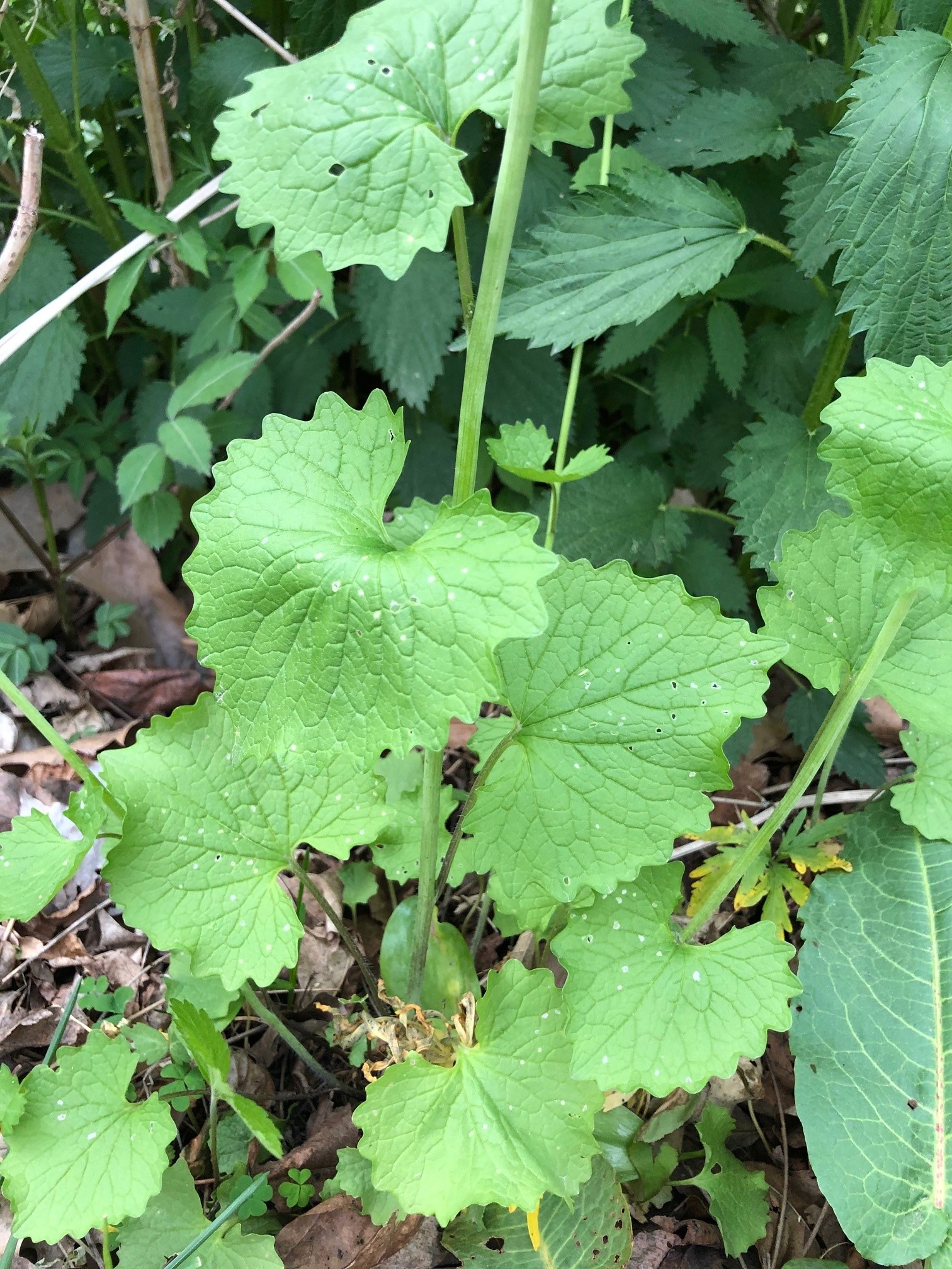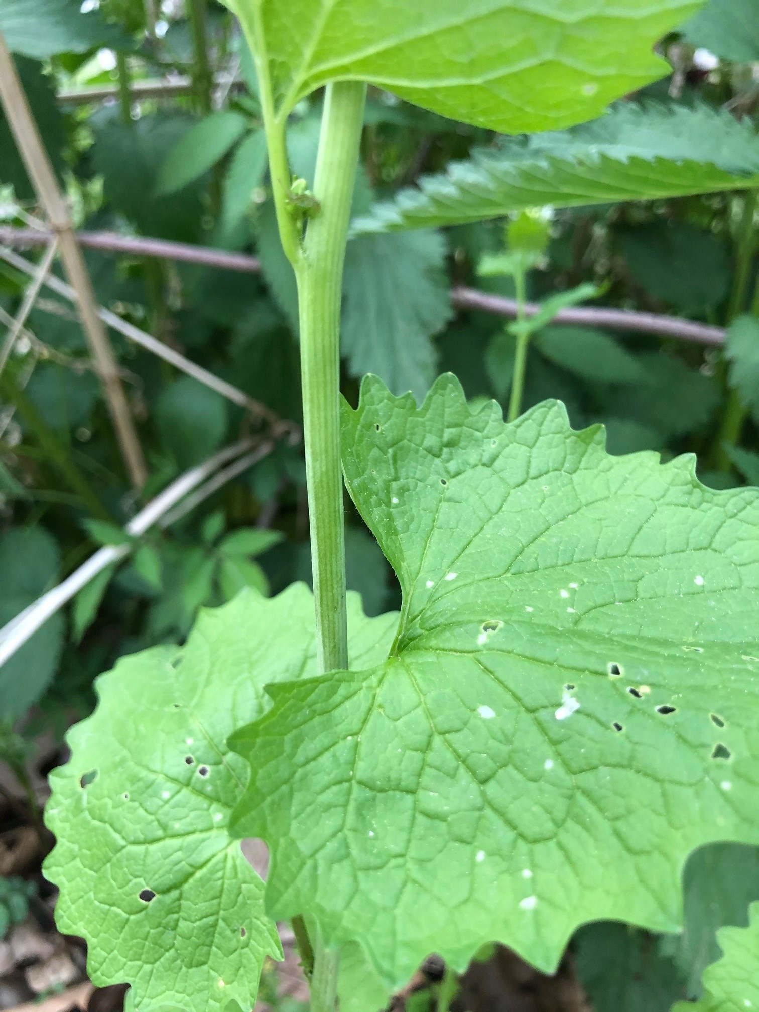 The first-year plant consists of a small rosette of heart shaped leaves. The leaf margins are shallow to coarsely toothed and wavy. The upper surface has a strong network of veins. The petioles of the lower leaves are long and slender. The second-year leaves are alternate and are similar in appearance. They are usually longer than wide. The foliage is light green in appearance. Plants will have a garlic odor when bruised or crushed.