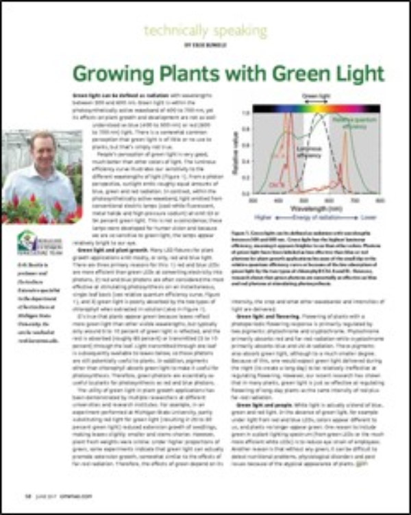 Green light can be defined as radiation with wavelength between 500 and 600 nanometers. Green light is within the photosynthetically active waveband of 400 to 700 nm, yet its effects on plant growth and development are not well understood.