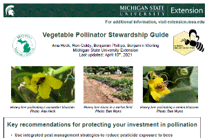 Esta Guía del Cuidado de Polinizadores de Hortalizas fué escrita por Ana Heck de la Iniciativa de Polinizadores de la Universidad Estatal de Michigan (Michigan State University) con aportaciones y consultas a productores, Educadores de Extensión e investigadores. La guía es un resultado del Plan de Manejo para la Protección de Polinizadores en Michigan.