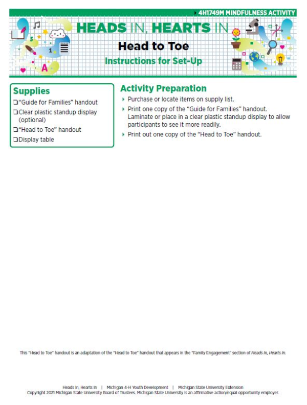 In this activity, you will teach the child a technique for feeling calm by doing a head-to-toe body scan. A body