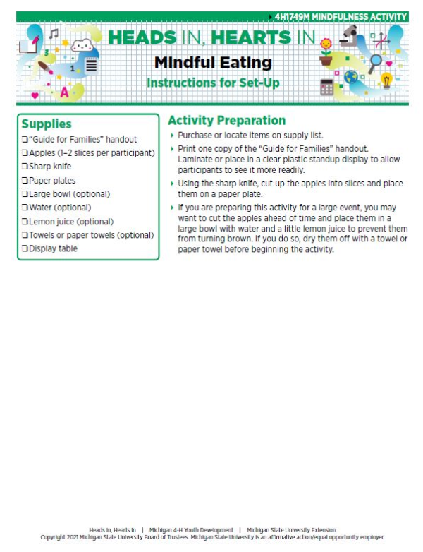 In this activity, you will practice mindful eating. The goal of mindful eating is to eat slowly using all of your senses. This activity will challenge you to slow down, eat with mindful attention and focus your energy on the present moment.