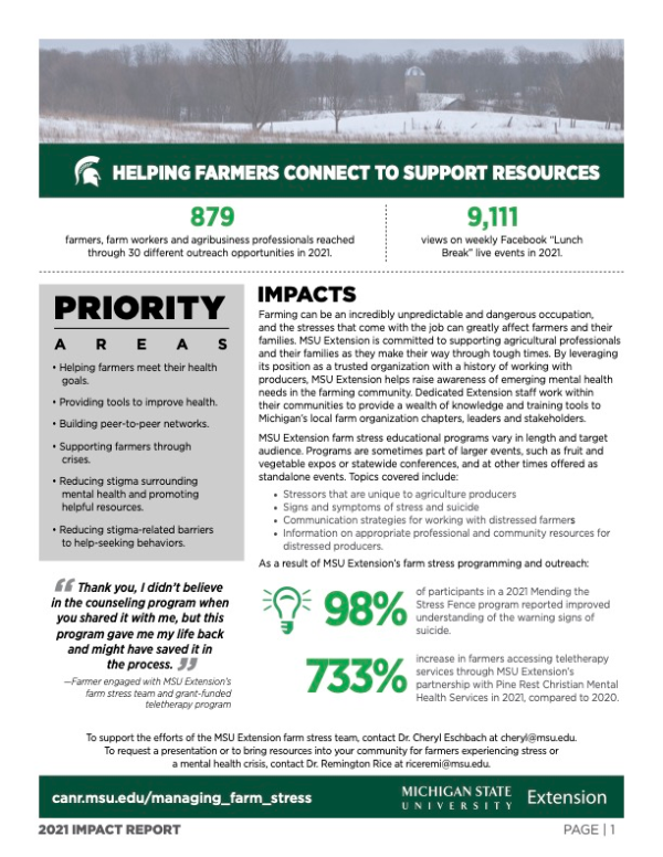 To support the efforts of the MSU Extension farm stress team, contact Dr. Cheryl Eschbach at cheryl@msu.edu. To request a presentation or to bring resources into your community for farmers experiencing stress or a mental health crisis, contact Dr. Remington Rice at riceremi@msu.edu.