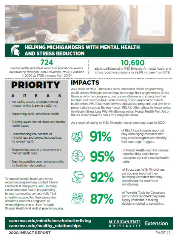 As a result of MSU Extension’s social-emotional health programming, adults across Michigan learned how to manage their anger, reduce stress, thrive as informal caregivers, practice mindfulness and strengthen their families’ and communities’ understanding of and response to mental health crises. MSU Extension delivers educational programs and one-time presentations such as the four-lesson RELAX: Alternatives to Anger series, five-lesson Stress Less With Mindfulness series, Mental Health First Aid or the six-lesson Powerful Tools for Caregivers series.
