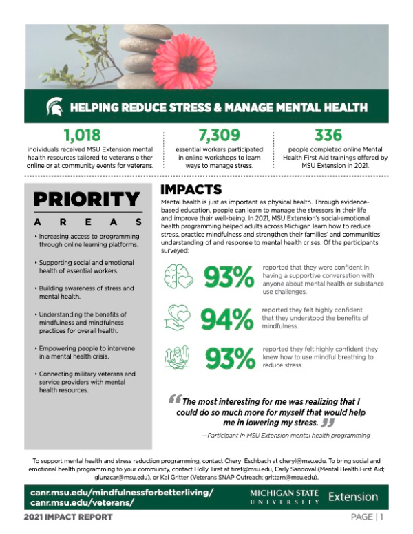 To support mental health and stress reduction programming, contact Cheryl Eschbach at cheryl@msu.edu. To bring social and emotional health programming to your community, contact Holly Tiret at tiret@msu.edu, Carly Sandoval (Mental Health First Aid; glunzcar@msu.edu), or Kai Gritter (Veterans SNAP Outreach; grittern@msu.edu).