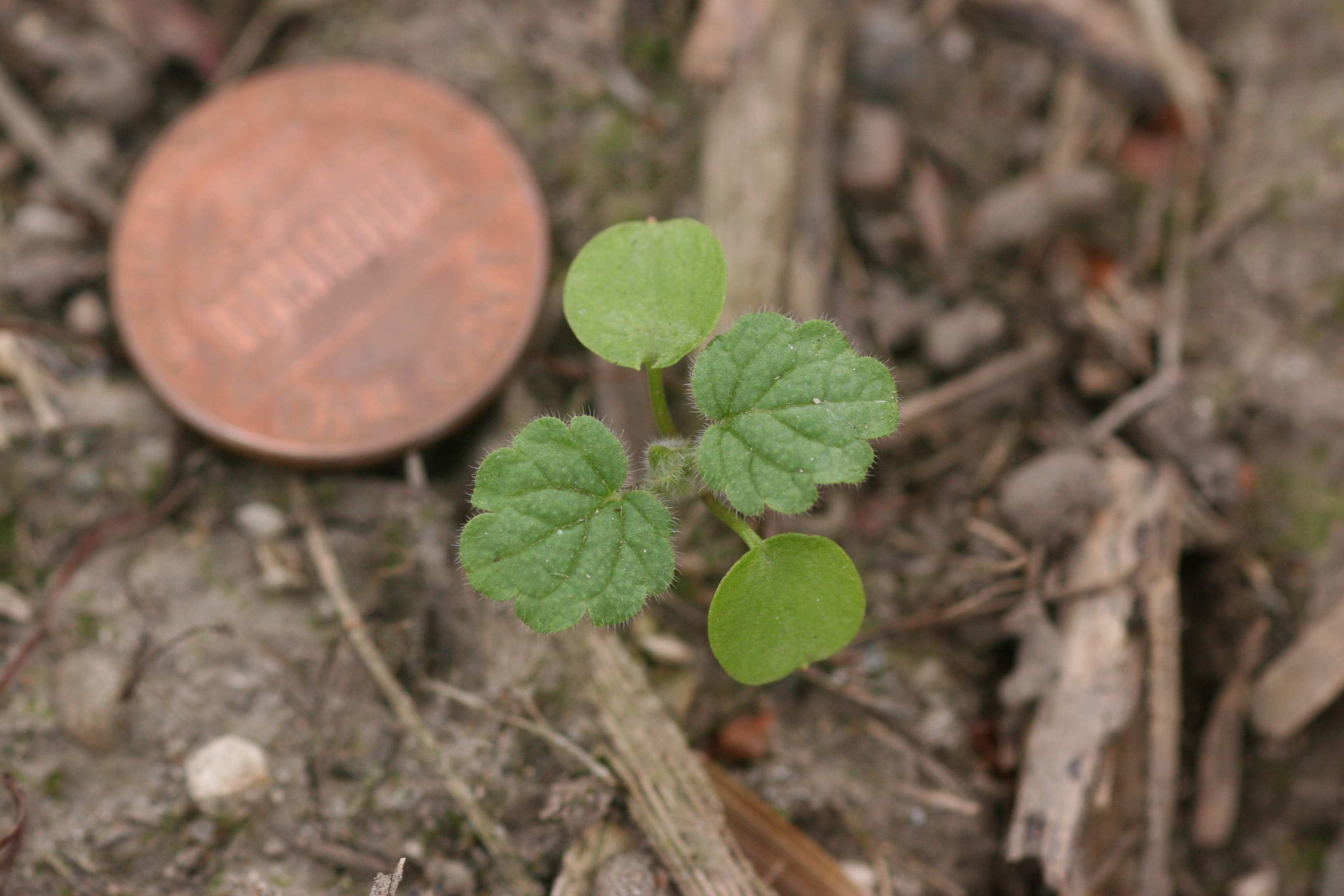 Cotyledons are oval in outline and notched at the base where the hairy petioles attach. Opposite, circular to heart-shaped, hairy leaves have rounded teeth along the margins. Prominent, palmately veined leaves give a crinkled leaf surface. Lower leaves are attached by long petioles; upper leaves lack petioles and encircle the stem.