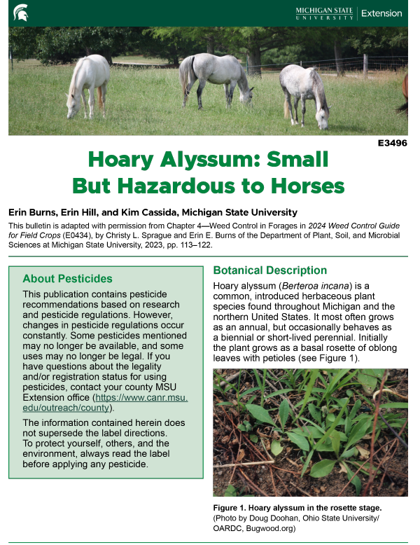 Some Michigan hay producers have been sued after they have unknowingly sold hay containing hoary alyssum to consumers who fed it to their horses. You can help protect yourself, your horses, and your hay buyers by regularly scouting for hoary alyssum in hayfields intended for horse feed. If you find the weed, sell the hay from that field as feed for animals other than horses.