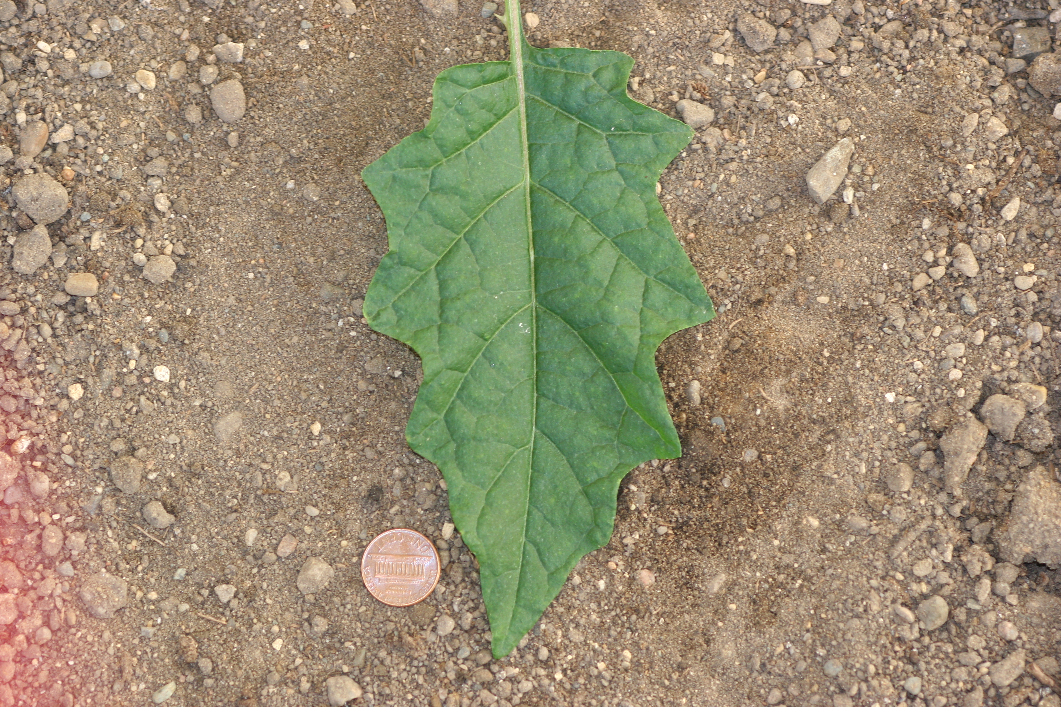 Alternate, egg-shaped, shallowly to deeply lobed, 2 to 5 inches long with sharp, prominent prickles on the leaf veins, midveins and petioles. Star-shaped hairs are present on both leaf surfaces.