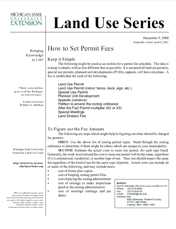 This bulletin is a discussion of the philosophy of what should be paid by fees and what should be covered by general fund moneys. It also presents work sheets for a municipality to establish zoning, land division and other permit fees.